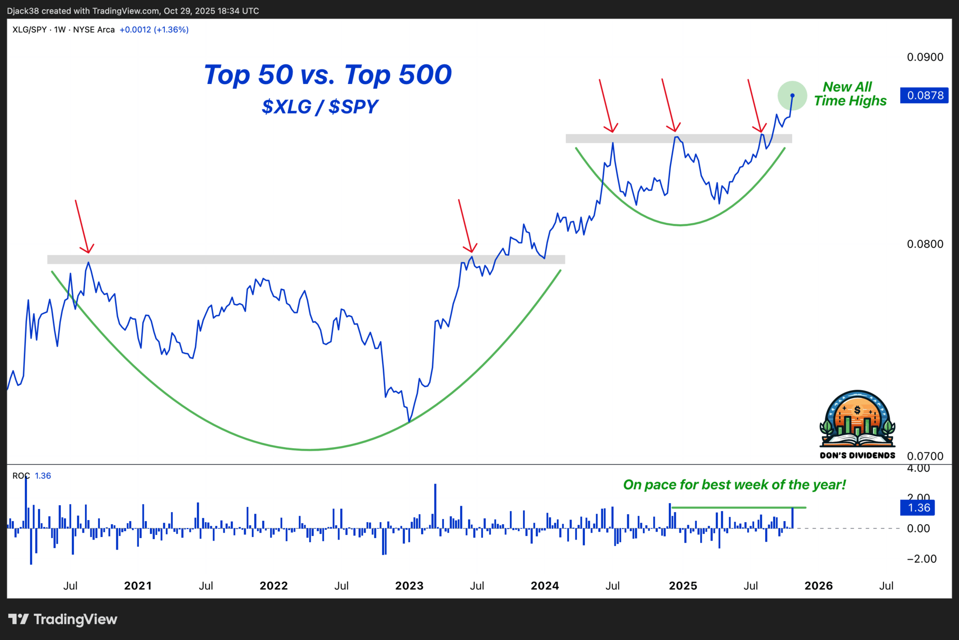 The biggest names in the market just keep getting bigger. The ratio of the Top 50 U.S. companies versus the broader S&P 500, has broken out to new all-time highs, and on pace for its best week of the year. This breakout is confirmation that the largest companies continue to be the place to be versus the rest. Yesterday, the top three largest companies in the world all closed at their highest prices ever. Leaders lead, and the others tend to follow. I wouldn’t take this as a negative sign for the broader market, but a positive sign signaling how strong the leaders really are. And with strong leaders, you have a strong team.